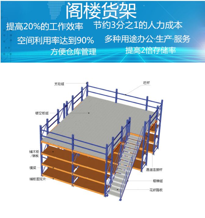 以增加存儲空間,可做二、三層閣樓,宜存取一些輕泡及中小件貨物,適于多品種大批量或多品種小批量貨物,人工存取貨物.貨物通常由叉車、液壓升降臺或貨梯送至二樓、三樓,再由輕型小車或液壓托盤車送至某一位置。適用于庫房較高,貨物較小,人工存取,儲貨量大的情況。