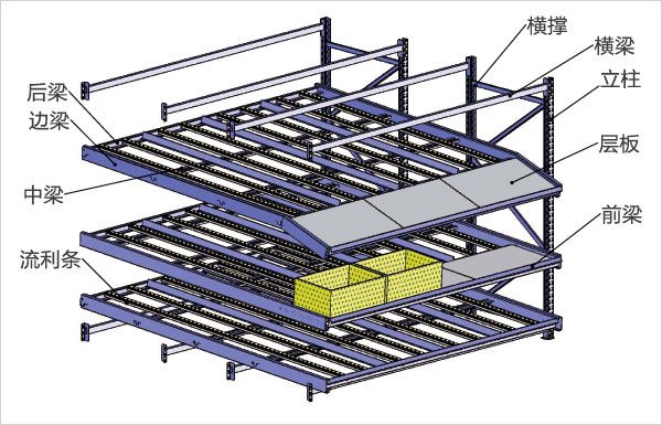 流利式貨架簡(jiǎn)稱流利架,是將貨物置于滾輪上,利用一邊通道存貨,另一邊通道取貨。料架朝出貨方向向下傾斜,貨物在中立作用下向下滑動(dòng)?蓪(shí)現(xiàn)先進(jìn)先出,并可實(shí)現(xiàn)一次補(bǔ)貨,多次揀貨。流利架存儲(chǔ)效率高。適合大量貨物的短期存放和揀選。流利架廣泛應(yīng)用于配送中心、裝配車間以及出貨頻率較高的倉(cāng)庫(kù)。