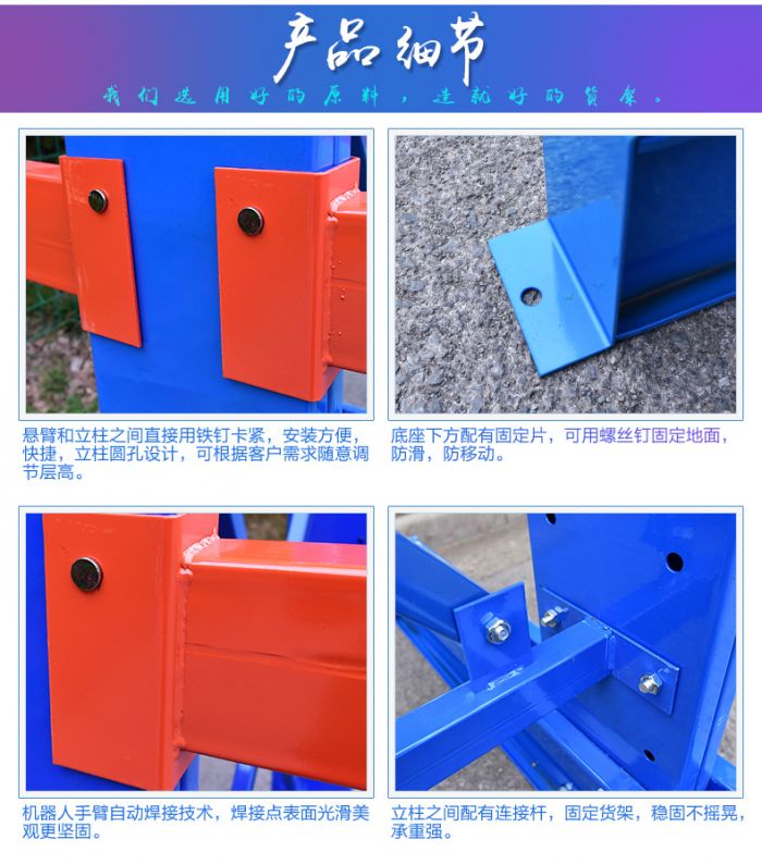 1、采用方管制作:懸臂式貨架根據(jù)相應的懸臂層載要求,先選定符合層載要求的方管,切割成需要尺寸,在一頭焊接防滑護板,另一頭焊接連接U型立柱連接件制作而成。