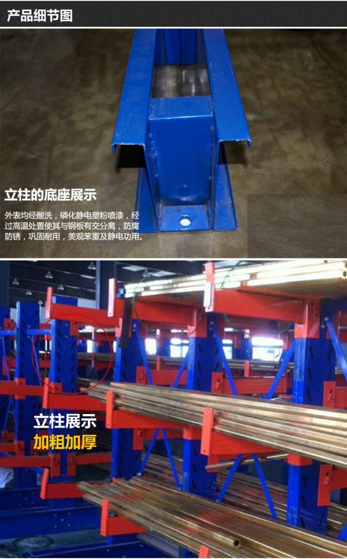 1、懸臂貨架系列全部采用組合式,拆裝,運輸,調(diào)節(jié),移動等簡易方便,安全可靠