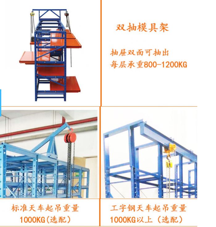 4、輕型模具貨架層載在200到800kg/層。重型抽屜式貨架層載在:800到1500kg/層。